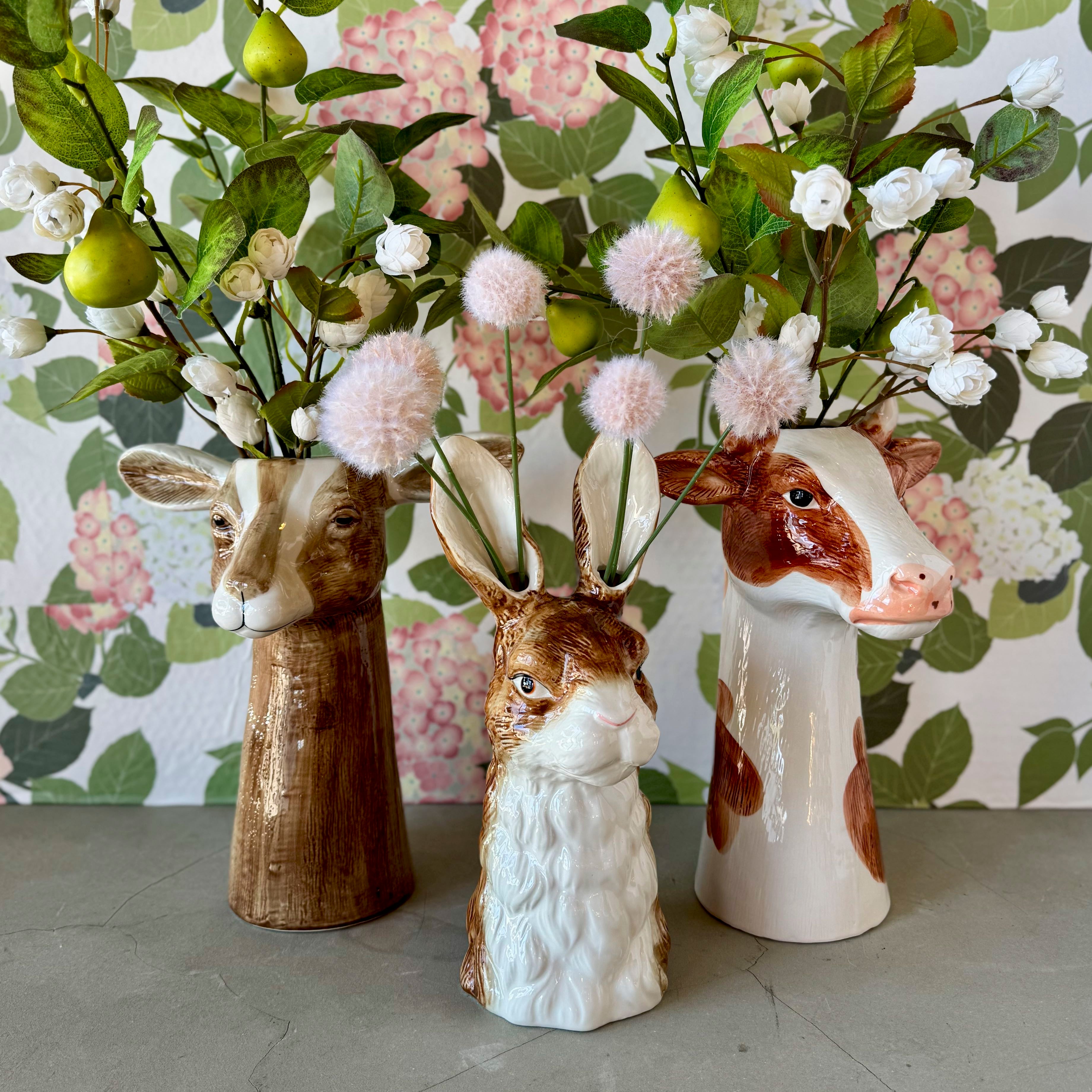 Add a playful and whimsical touch to your home decor with this round stoneware vase! Featuring a hand-painted rabbit design and a warm brown and white color scheme, this charming vase is perfect for displaying fresh or artificial flowers, plants, or branches. Its unique and adorable design can elevate any room in your home, from the living room to the kitchen. Whether you have a farmhouse, garden, novelty, or country style, this vase will add charm and whimsy to your space. It also makes a fantastic gift for art and animal lovers! 5"Lx4.25"Wx11.75"H