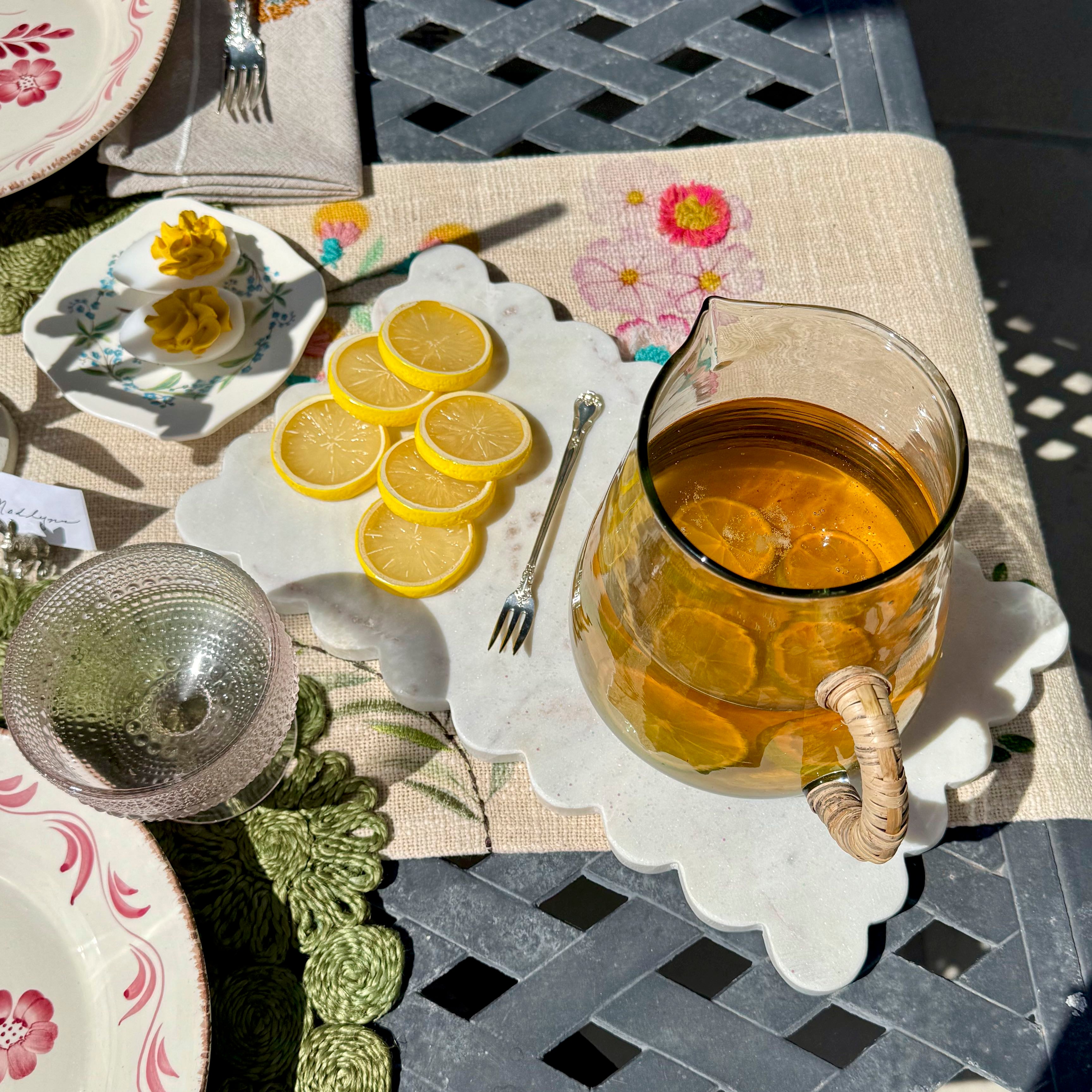 What's better than a marble cheese board? A scalloped edge marble cheese board. What we love about this board is the scalloped detail gives a soft charming appeal to such a hard stone. I use mine in the bathroom as a tray for my crystal mouthwash bottle and pressed glass containers. Also looks great sitting on a kitchen island or coffee table. A staple for the home. 14"L x 8"W