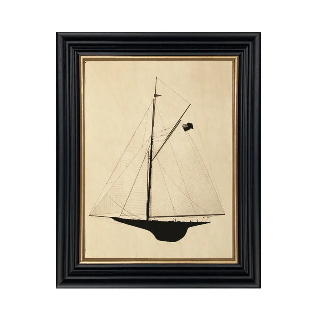 The Shamrock III was the Royal Ulster Yacht Club’s contender in the 1903 America’s Cup. This charming silhouette print makes a delightful addition to any wall gallery or stands out beautifully on its own. Printed on specially aged paper for a vintage feel, it’s framed behind glass in a 10" x 12" black wood frame with elegant gold trim. Ready to hang with a sawtooth hanger on the back. Proudly handmade in the USA.