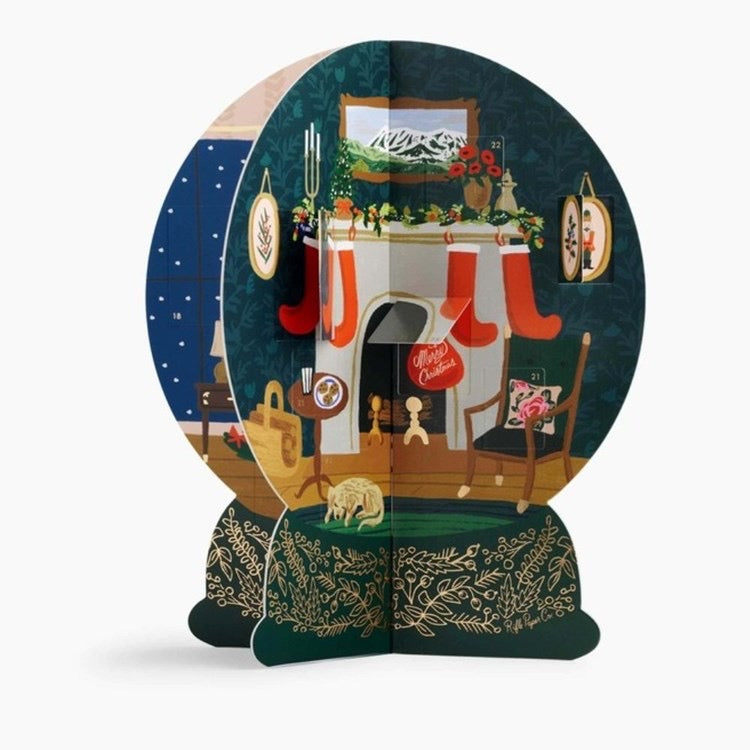 Celebrate the countdown to Christmas with our charming Snow Globe advent calendar! This stand-alone calendar showcases four joyful holiday scenes and includes 25 little doors hiding delightful surprise illustrations. Measures 10" wide by 8.5" deep and 12.25" tall, perfect for holiday fun.