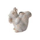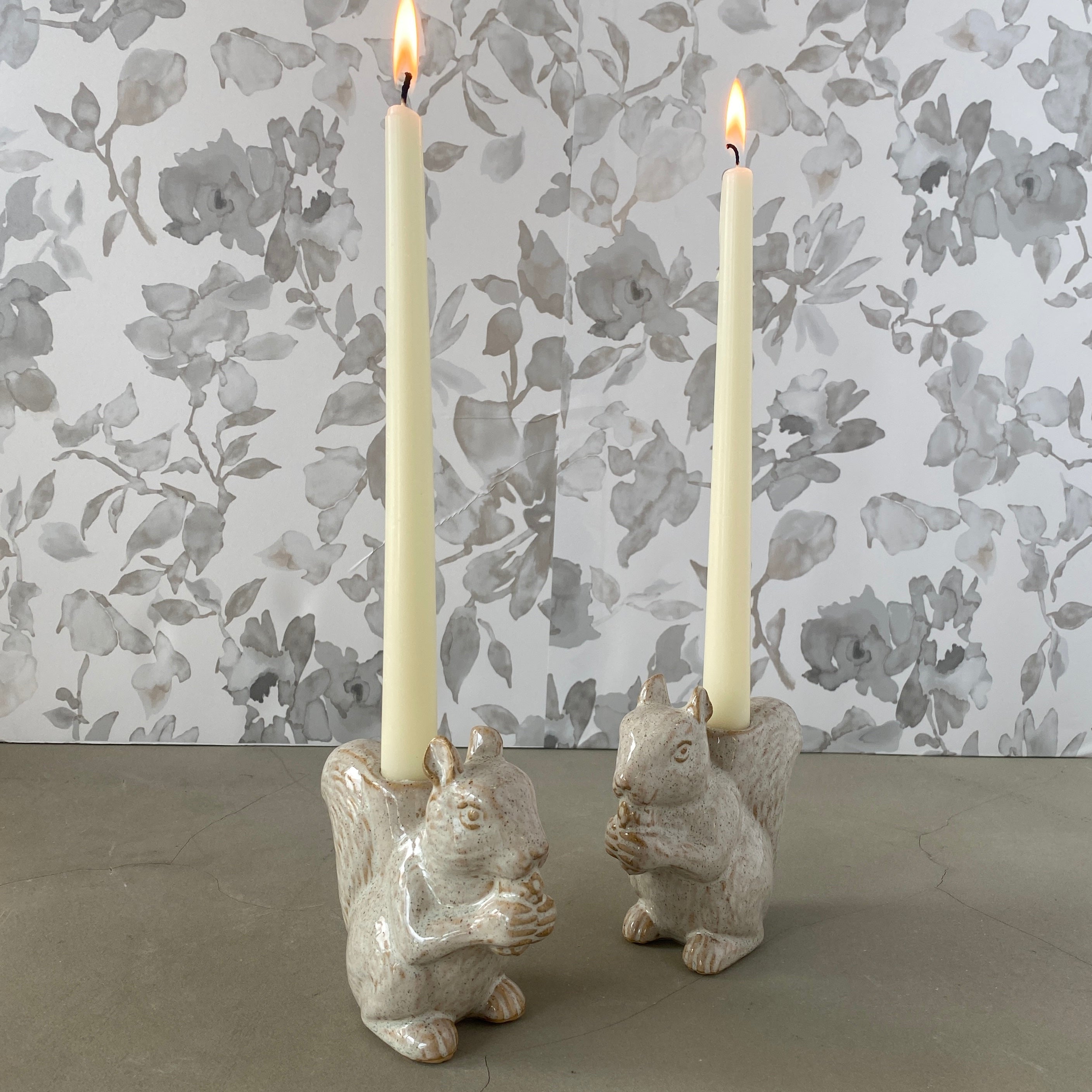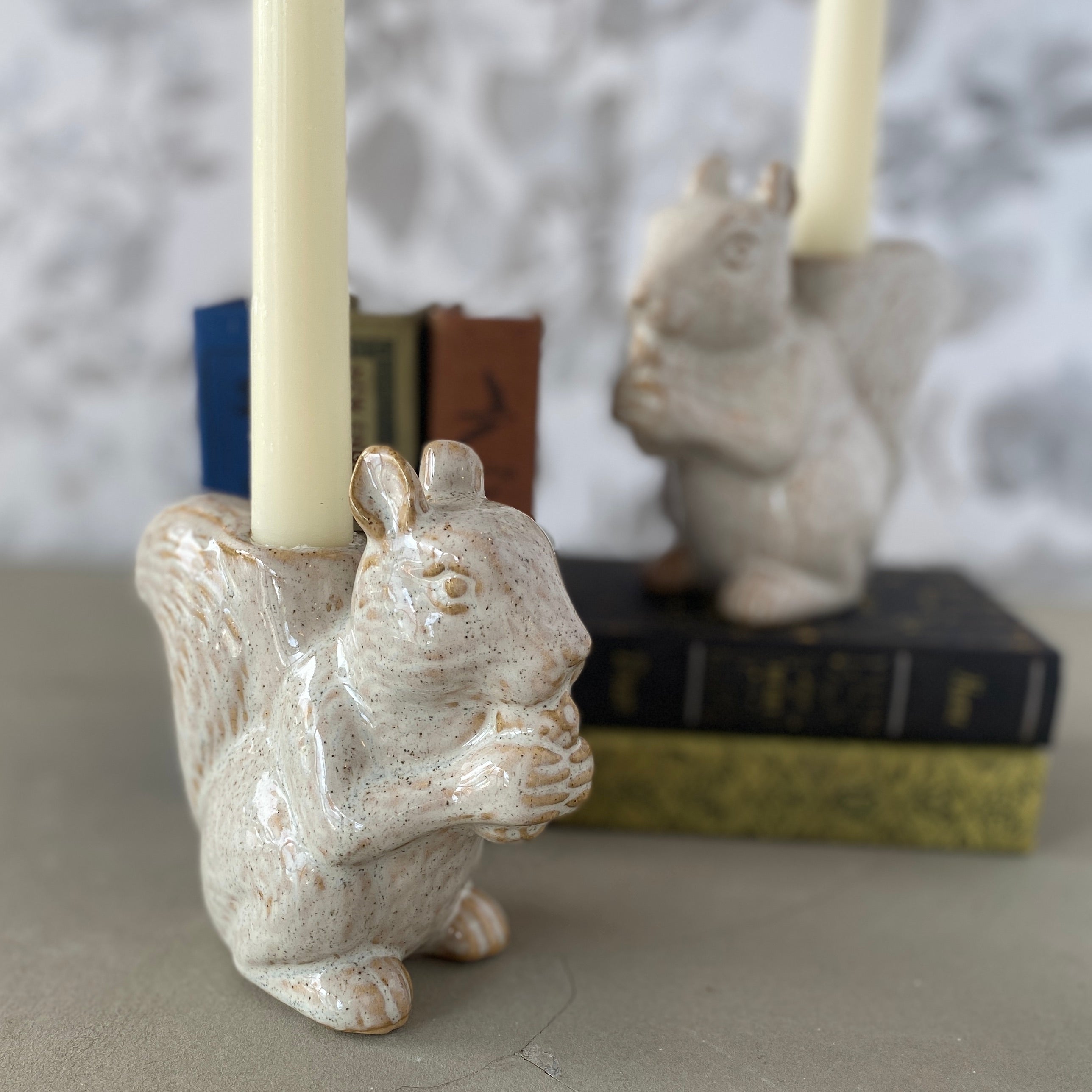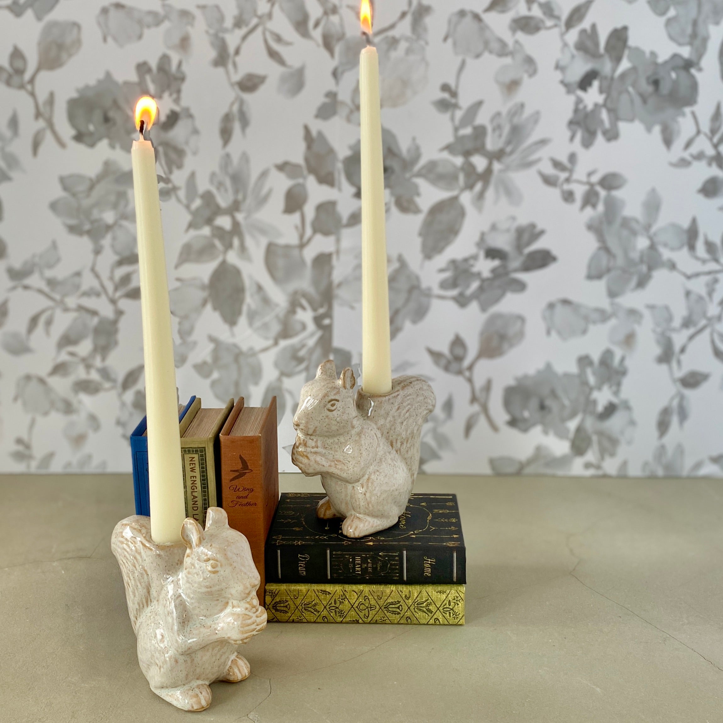 This charming bisque ceramic critter, dripping in a hint of grey glaze, stands ready to keep the home fires burning, as he busily stores his winter provisions. The Squirrelly Candleholder offers an elegant and tasteful way to light the night with a taper candle. 4.75"H x 2.25"W x 4.75"L