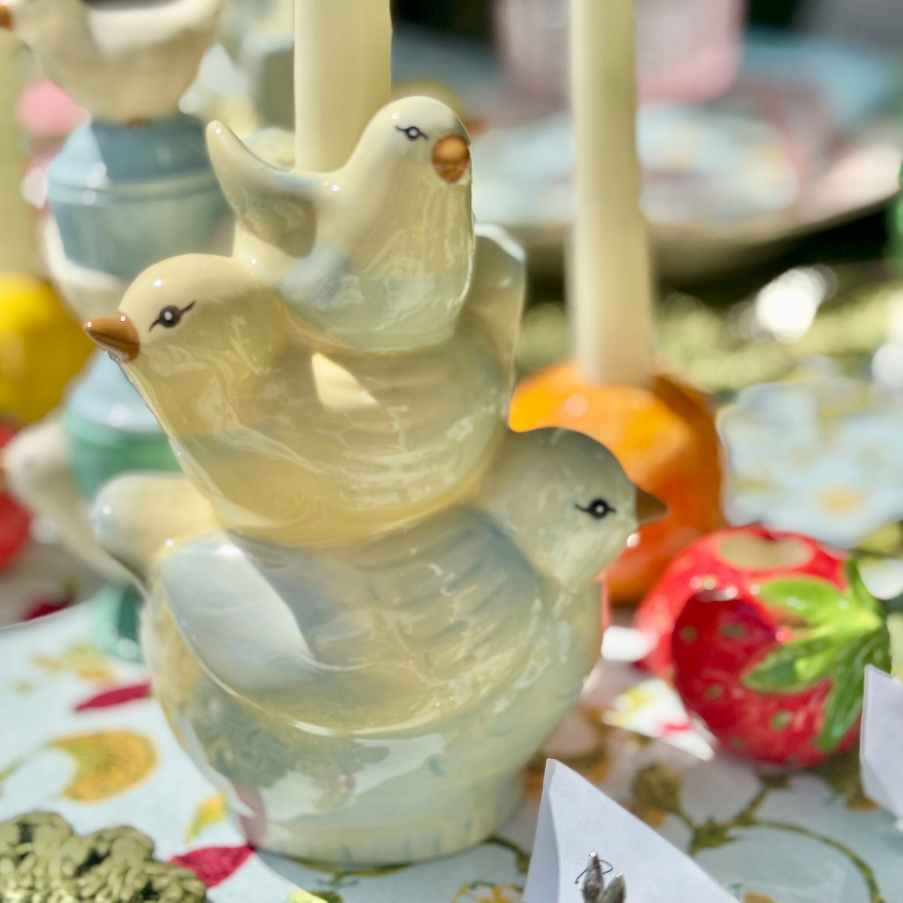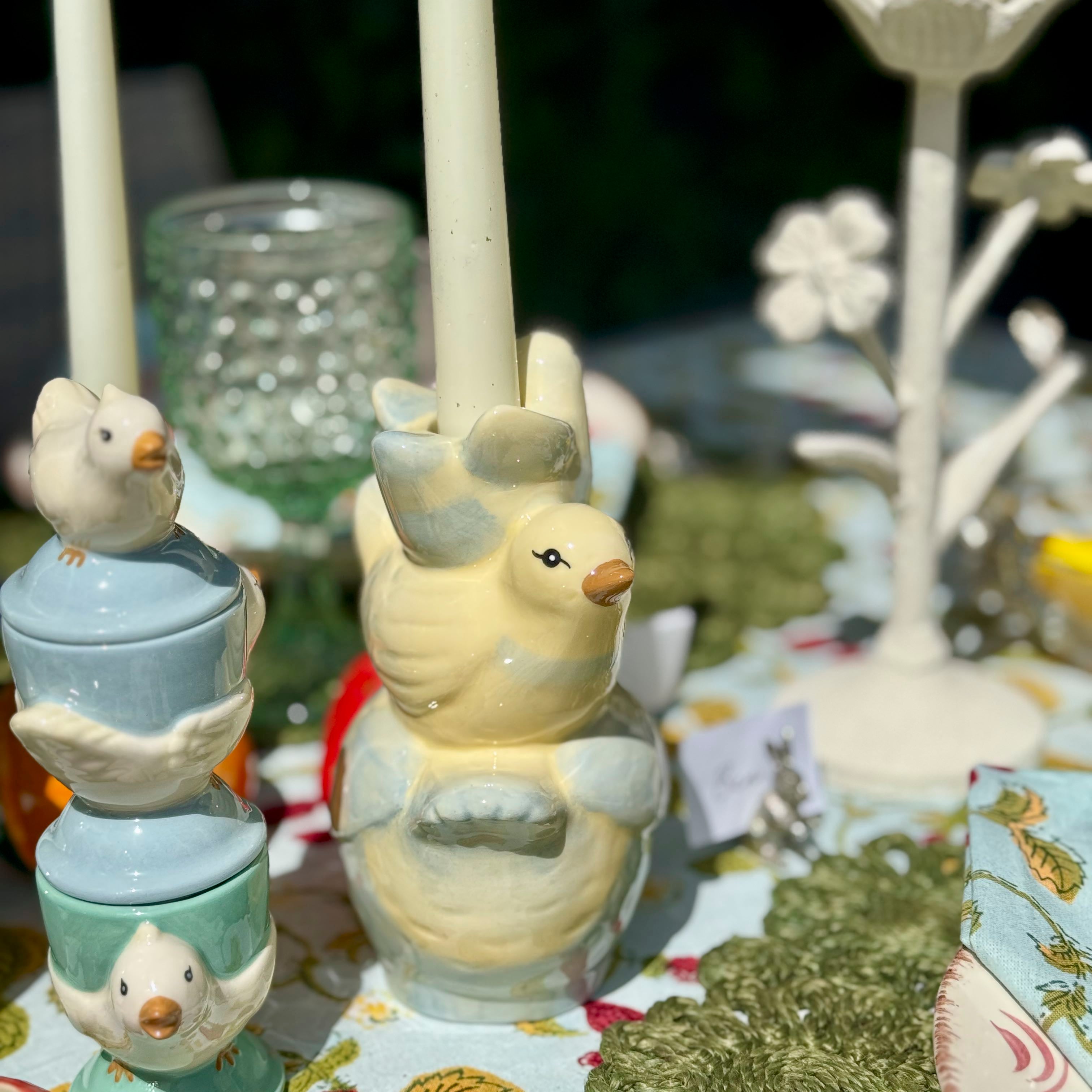 Craft a darling, retro centerpiece with the adorable Stacked Chicks Candle Holder, showcasing 3 hand-painted chicks snuggled up and ready for a taper candle. Elevate your Easter table with our charming selection of Spring decor. 5"Lx3.5"Wx6.75"H