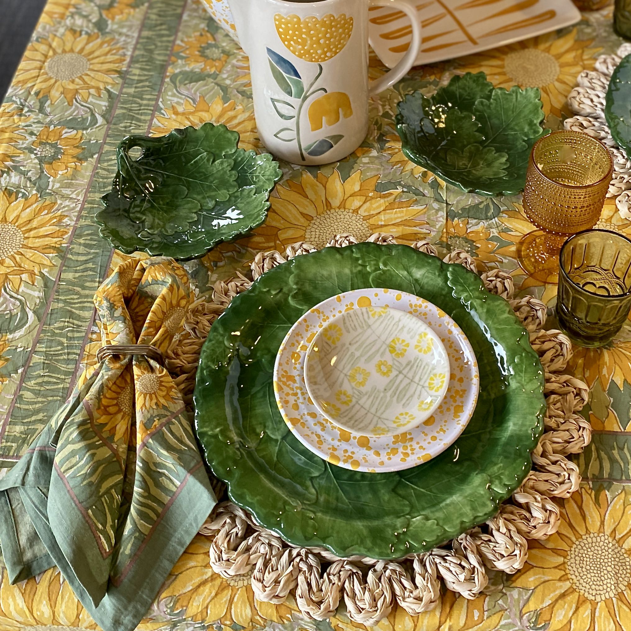 Experience the luxurious beauty of the French countryside with our Sunflower Tablecloth. Inspired by the rolling vistas and blooming sunflower fields, this exquisite tablecloth adds a touch of summer warmth to any home. Each piece is handprinted by skilled artisans using a traditional technique, making it a true work of art. The richly colored pattern captures the natural splendor of Southern France and pairs well with everyday use. Measuring 59"x59" and made from high-quality materials, this tablecloth is both machine washable and colorfast. Enhance your table setting with this elegant and exclusive piece.
