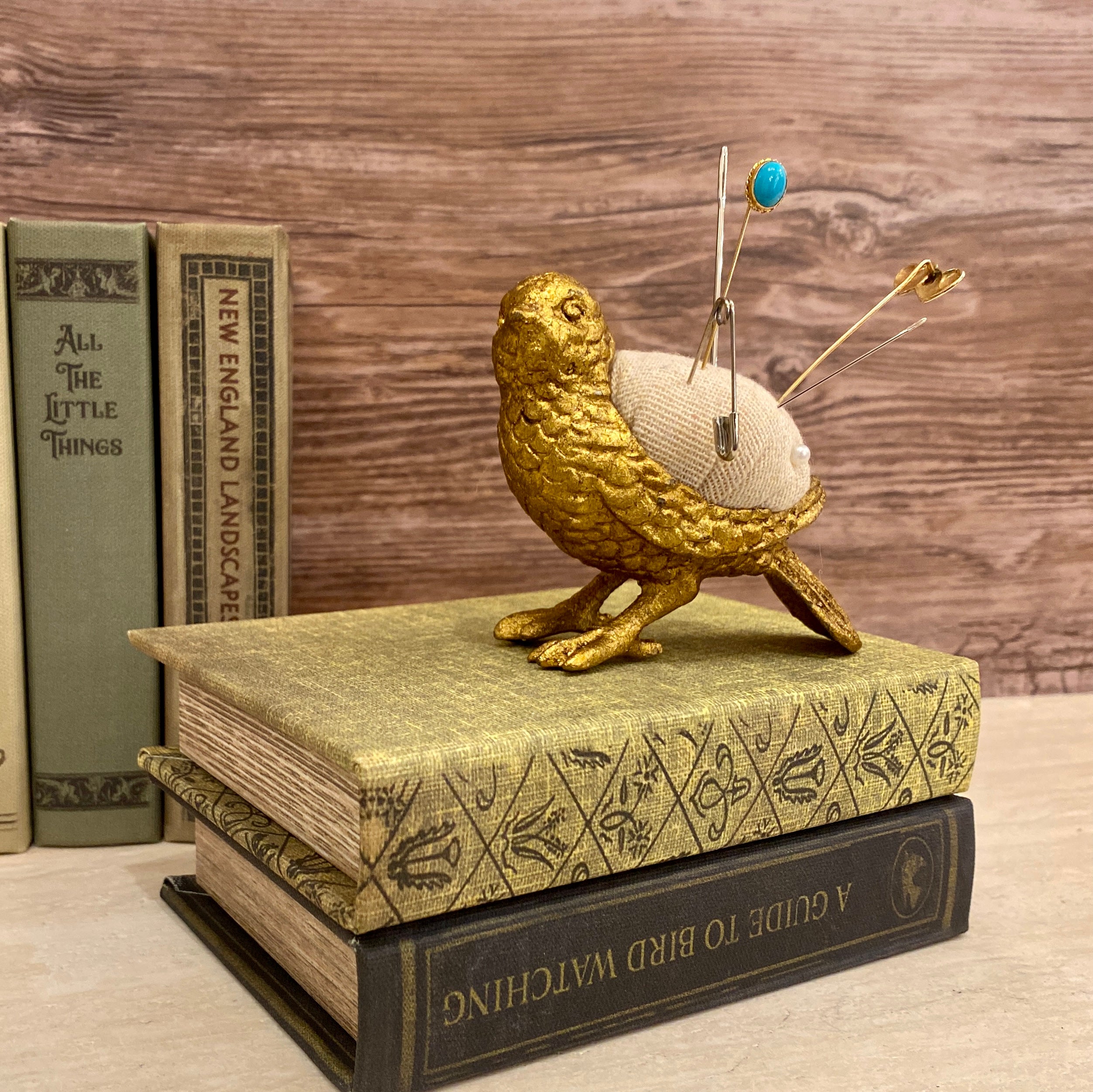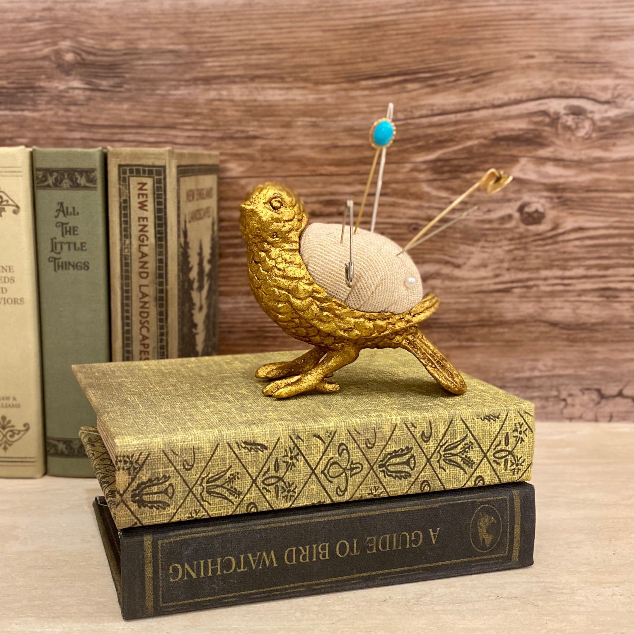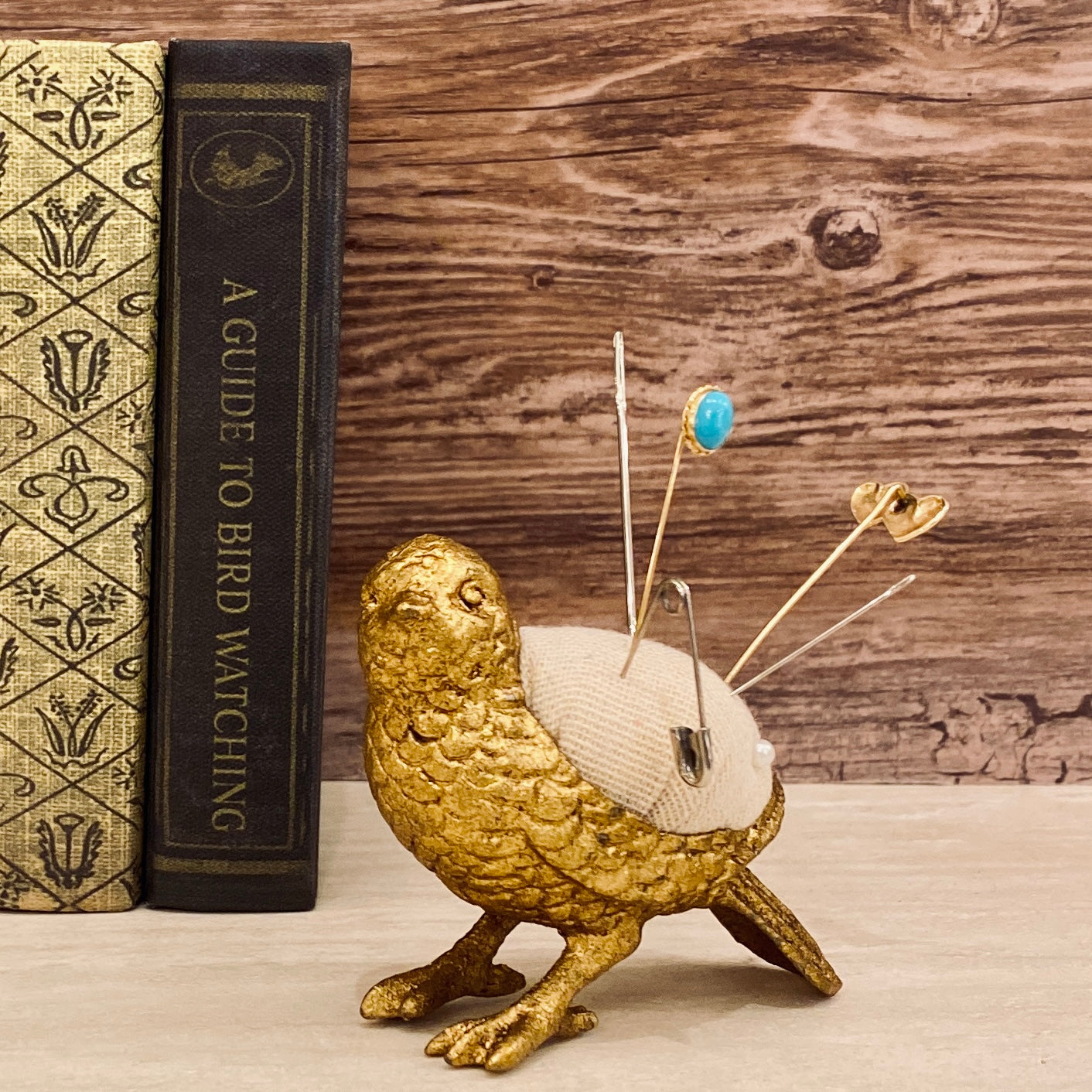 Add a touch of sweet charm to your sewing projects with the Sweet Tweets Pin Cushion! Featuring a vintage-style, antique gold finish, this cushion will stop your pins from "tweeting" from the table to the floor. Perfect for displaying stick pin and hat pin collections. 3"W x 1.5"D x 2.75"H