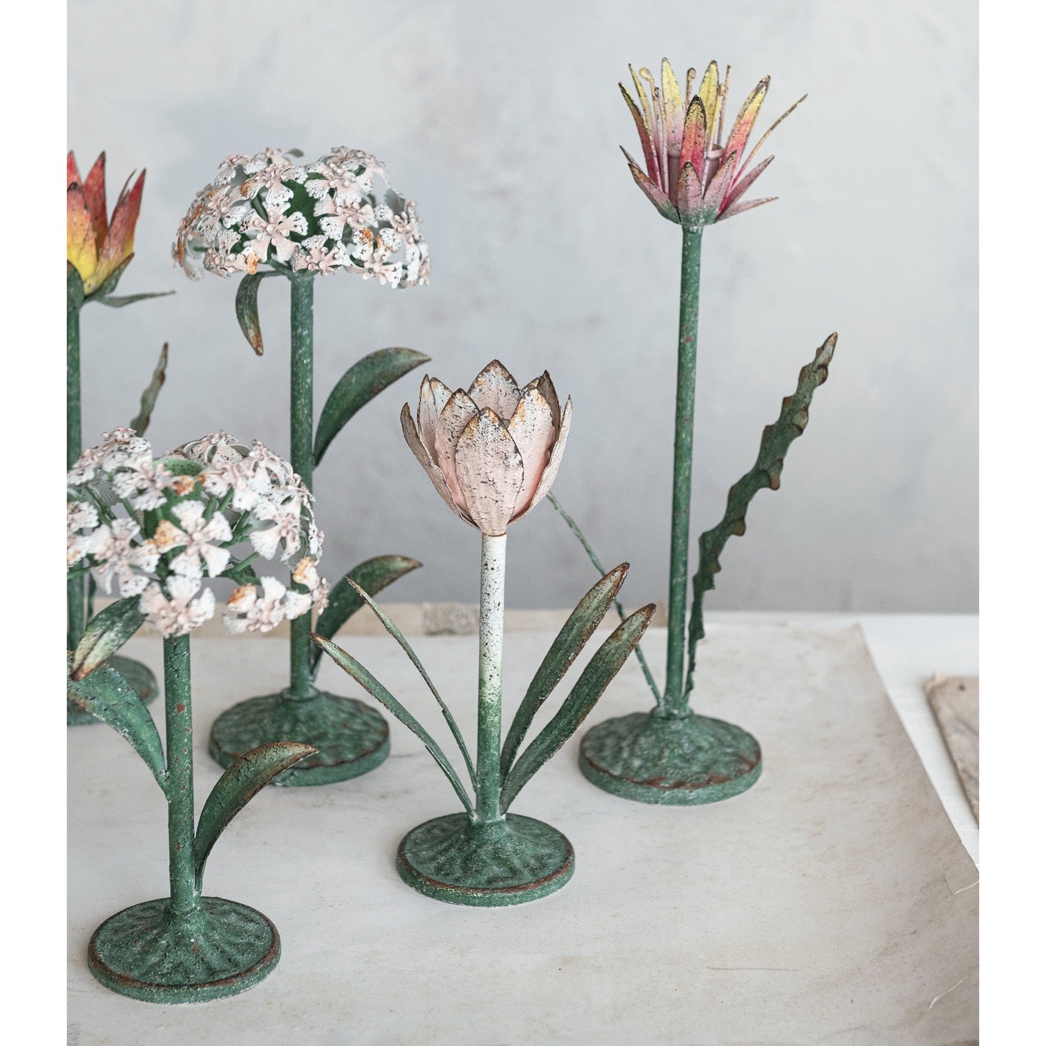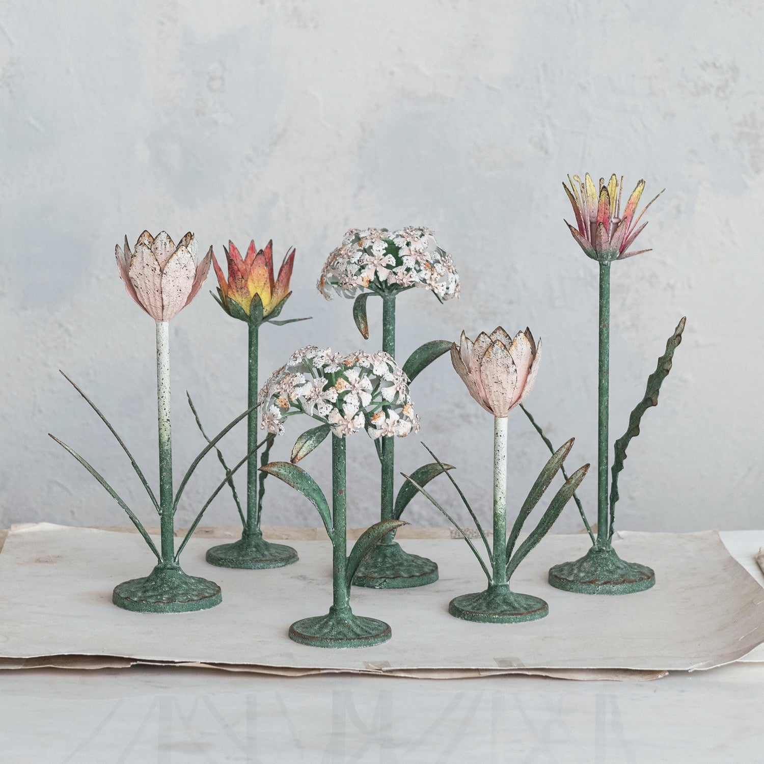 Channel your inner flea market aficionado with these vintage-inspired toleware flower candleholders. Made of painted metal, they'll add a touch of whimsy to your dining table. The distressed finish adds an extra layer of charm, making them look like a true flea market gem. Set of 3. Large 10.75"Hx4.8"W, 2 small 9"Hx4.8"W