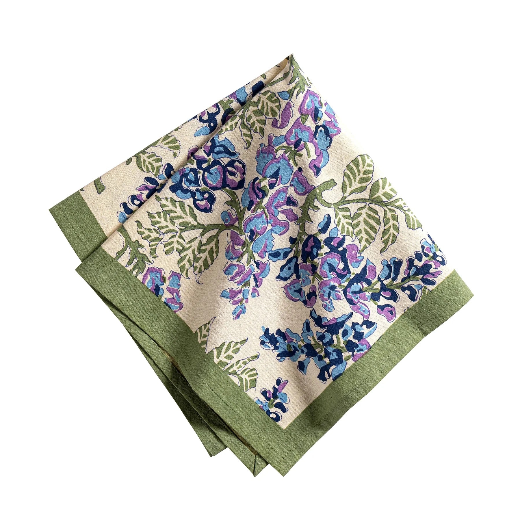Indulge in the luxurious Wisteria Napkins, adorned with olive green vines and delicate pendant-like blooms. The ivory background, complemented by cascading blue and purple-tinged flowers, creates a stunning canvas for your culinary delights. Immerse yourself in the elegance of Southern France with our exquisitely hand-printed, cotton linens. Perfect for everyday use, these linens are thoughtfully crafted for easy care and lasting color. Each handmade piece is one-of-a-kind, adding a touch of exclusivity to your home. 100% cotton, machine washable, colorfast. 19"x19". Set of 6.